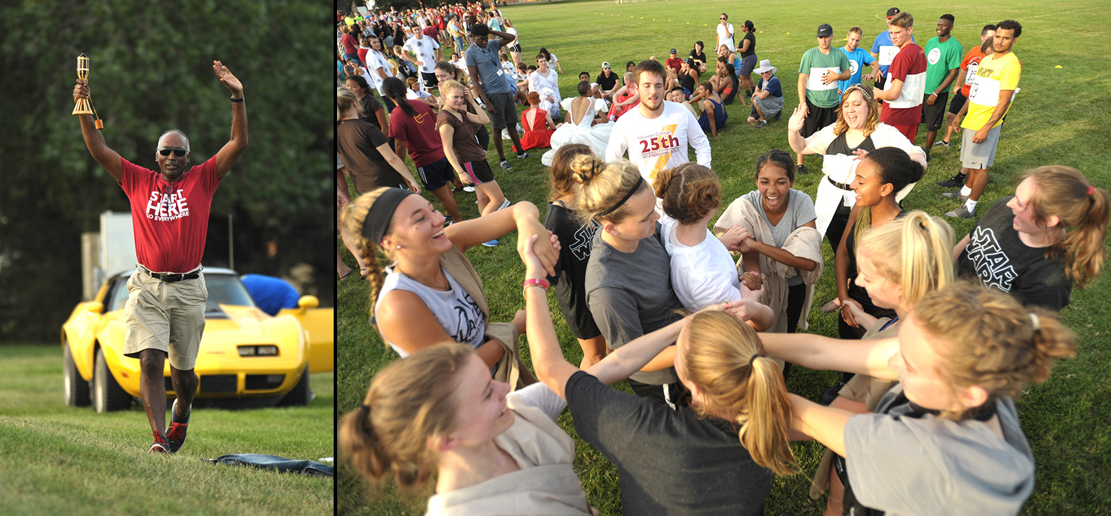 captions - (left photo) President Dr. Joseph Manickam runs the “official Mod Olympics torch” on its final leg to declare the opening of the 108th Mod Olympics; (right photo) A mod works to untangle themselves during the “Human Knot” game at Mod Olympics, the final kick-off event of Opening Weekend prior to the start of classes. Each mod’s uniquely themed style of dress and the nonsensical games allow students to have fun and get to know one another in a laid back setting.