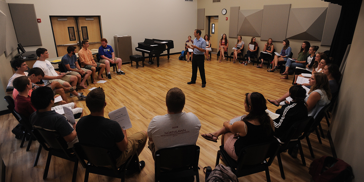 The Bel Canto Singers meet for the first time on the first day of classes, Aug. 17, with new music faculty member Russell Adrian (center) in the choral rehearsal space in the newly renovated Northlawn Center for Performing Arts Education.