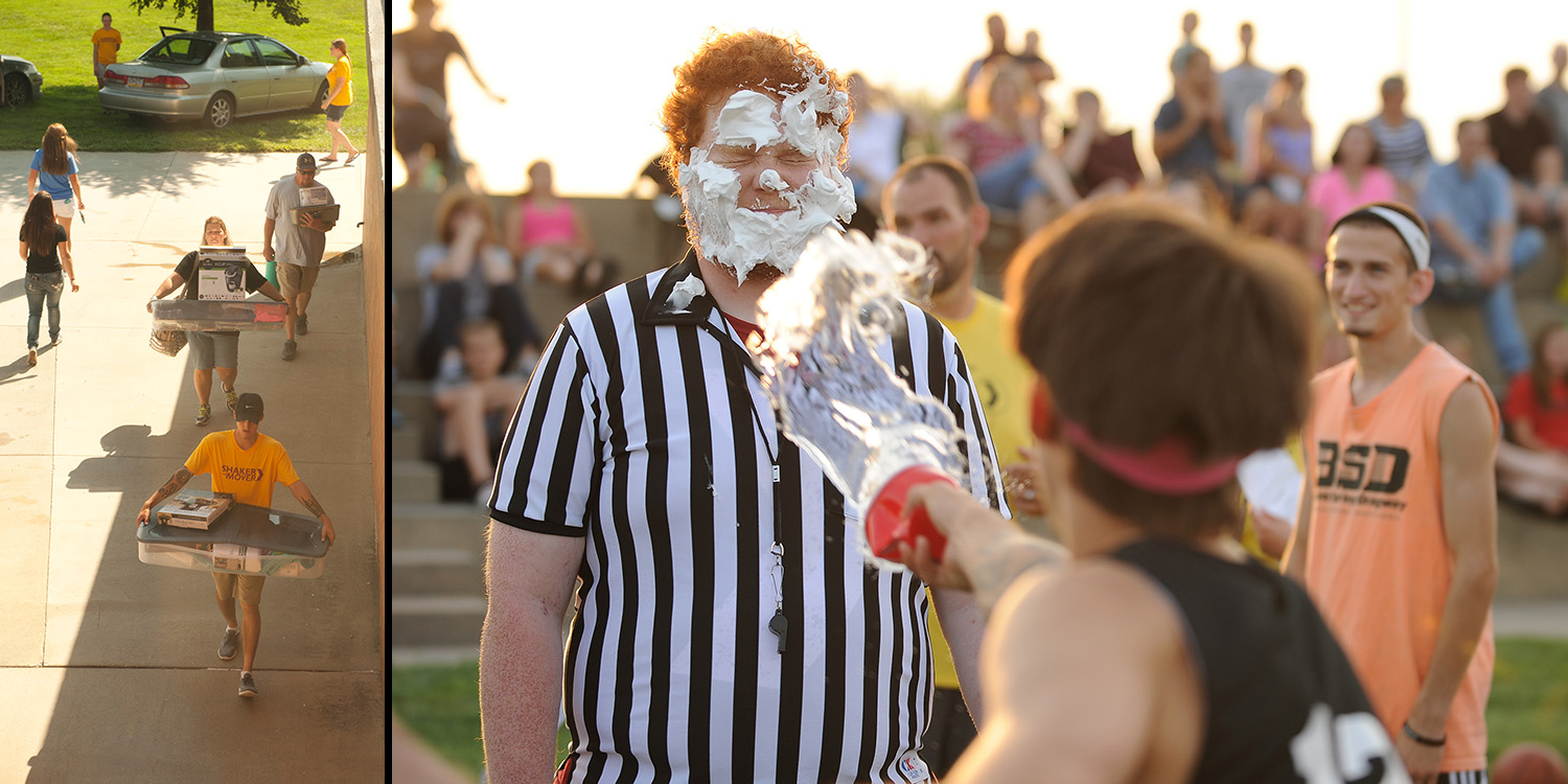 Shaker and Mover Cody Halvorson (Temple, Texas) moves a fellow student’s belongings into the dorms; Resident Assistant Brady Bilderback (Boise, Idaho) braces for a face full of water as his mod mates try to “clean your RA” during the annual Sunday evening Mod Olympics.