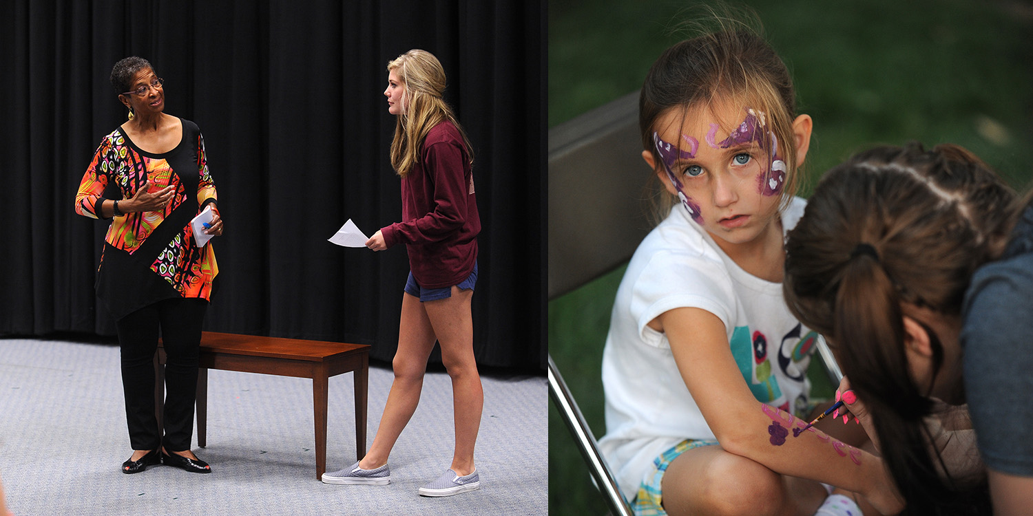 Above - (left) Guest presenter Egla (Birmingham) Hassan, who taught drama at Hesston from 1977 to 80 works with Hesston College acting student Abbie DeWild (Kalona, Iowa) on a monologue Sept. 25; A young guest at the Friday evening Family Festival has her face and arms painted.
