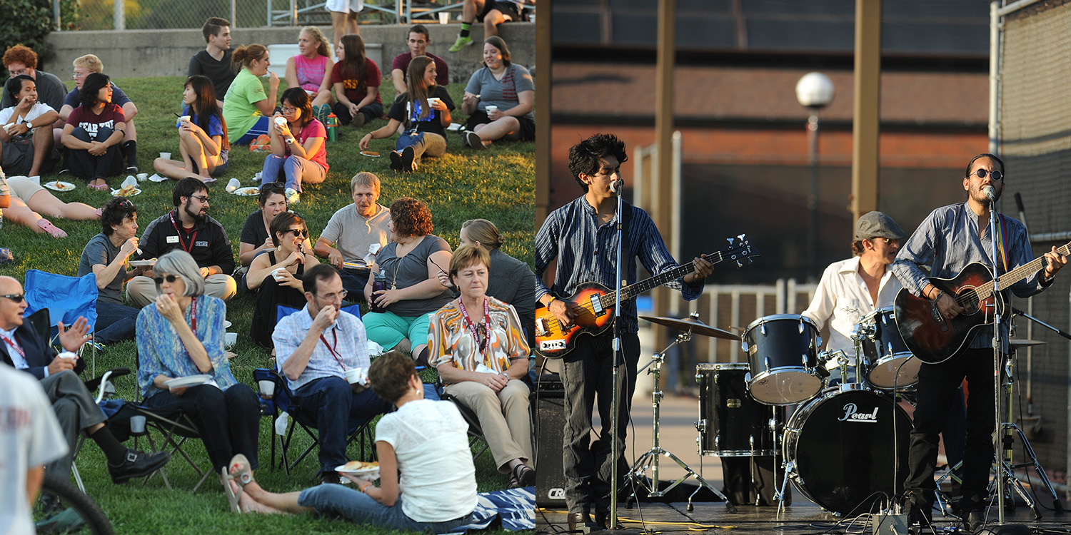 Above - (left) Hesston College students, alumni and friends enjoy a tapas meal on the lawn; La Republica, a Latino rock band with member Daniel Moya (right), a 2008 graduate, performs on the entertainment stage during the Family Festival. Also pictured are Juan Moya (left) and David Guevara (center). The band is based out of Mexico City.
