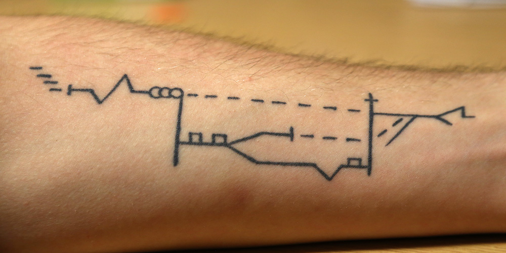 Hesston College class of 2014 graduate Nathanael Ressler recalls this experience of when he got his first and only tattoo: the timeline of the Heilsgeschichte, the chronological story of the people of God studied in the college’s Biblical Literature course.
