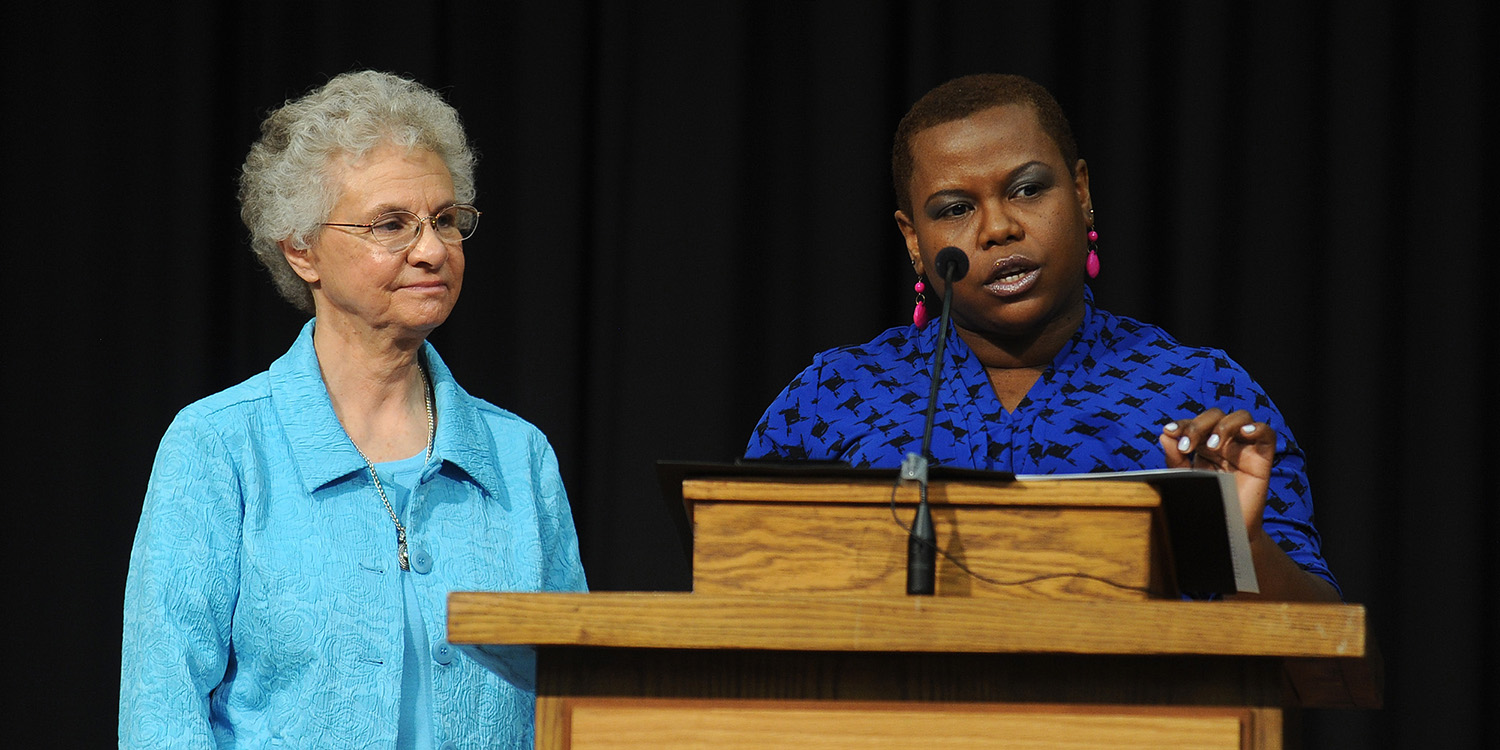 Hesston College natural science faculty member Marelby Mosquera (right) and nursing faculty member Joyce Huber (left) deliver a joint-address encouraging graduates to carry Hesston College values with them throughout life at commencement exercises May 11.