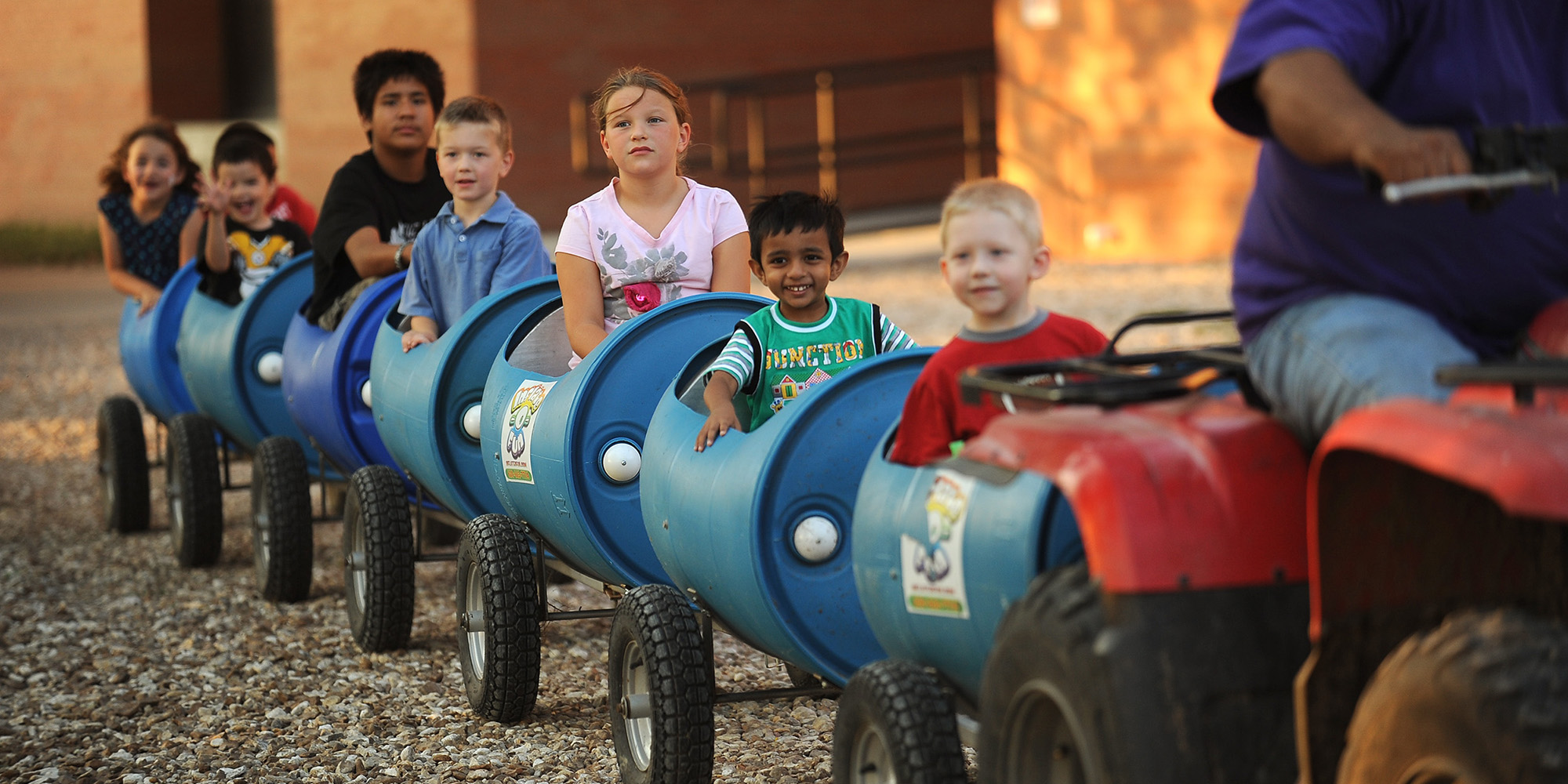 Children enjoy a barrel train ride around campus at the Friday night Family Festival. Alumni, faculty, staff, students and local families came out for the event that included children’s activities, a barbecue picnic and Larks athletic events.