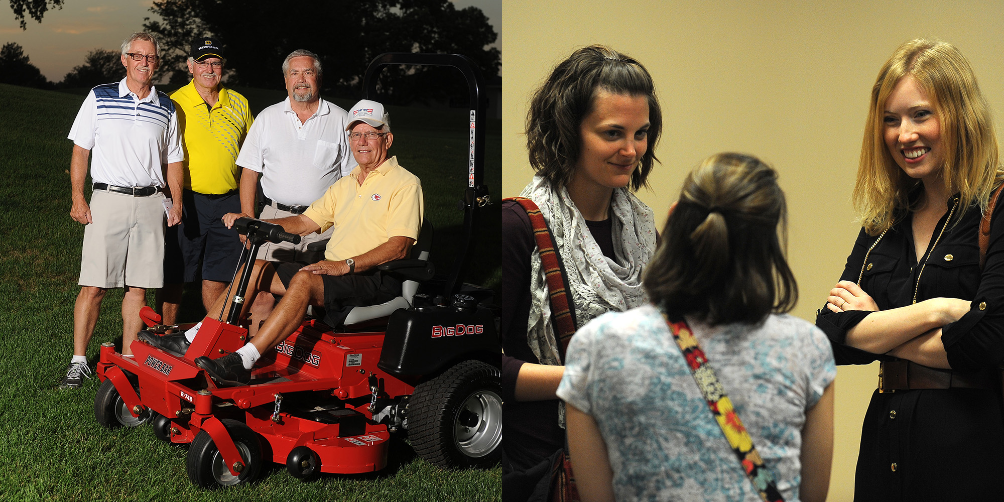 Left - Harold Winsinger of Hesston, Kan., won the Big Dog mower given by Excel Industries at the first Hesston College Student Scholarship Golf Tournament sponsored by Excel. Winsinger returned the mower and it was put up for auction and purchased by Norm Yoder of Henderson, Neb. Pictured from left are Bob Mullet, vice president of Excel; Paul Mullet, president and CEO of Excel; Yoder and Winsinger. The new event hosted 68 golfers and proceeds benefited the Jim Boyts Scholarship. Right - Bethany Miller (Hesston, Kan.) and Megan Miller (Wichita, Kan.) talk with Amanda Yoder (Goshen, Ind.), a fellow Hesston College Class of 2008 alumna during class reunions Sept. 28.
