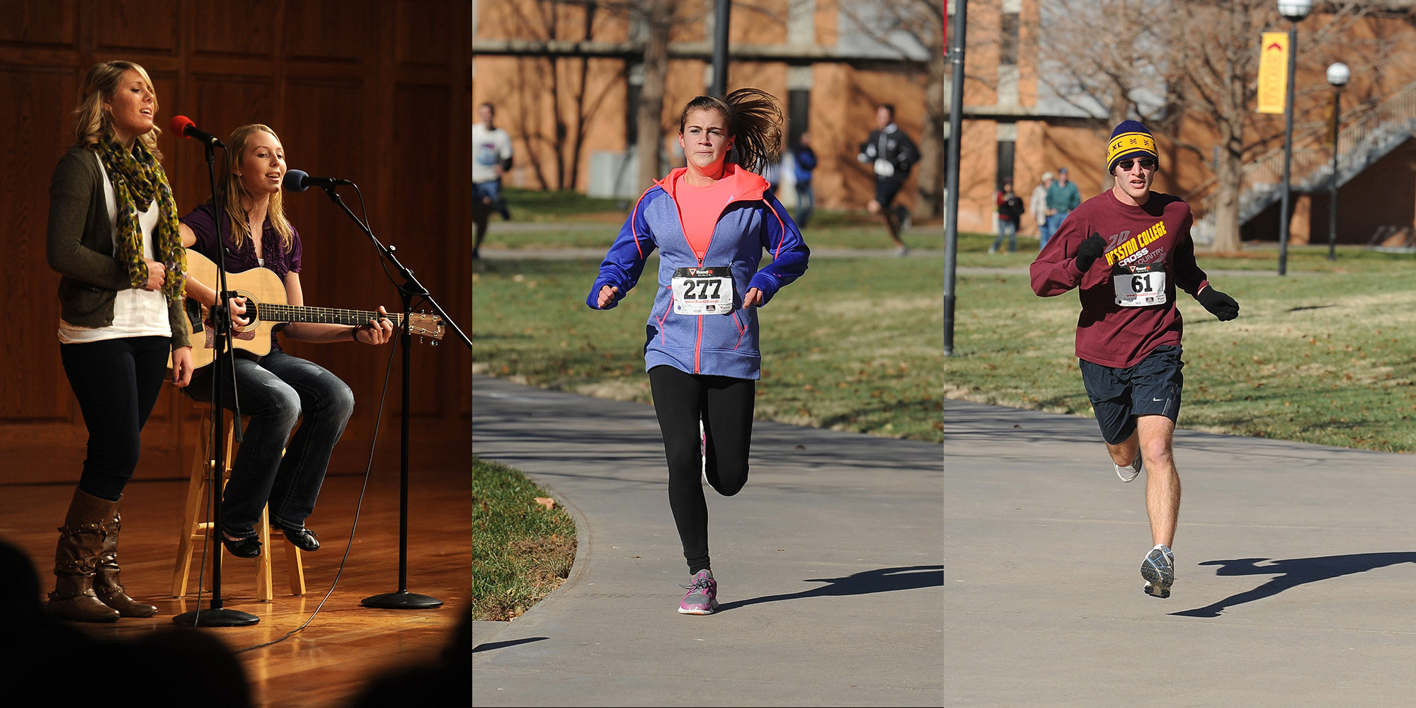 left to right Freshman Carley Wyse (Archbold, Ohio) and sophomore Rachel Miller (Hutchinson, Kan.) perform a song during the Thanksgiving Talent Show.Freshman Carley Wyse (Archbold, Ohio) and sophomore Rachel Miller (Hutchinson, Kan.) perform a song during the Thanksgiving Talent Show; Howard Hustle women's winner Mikala Heddin (below) of Hesston crosses the Howard Hustle finish line with a time of 13:05 as the top female finisher. Many community members, like Heddin, participate in the annual run/walk; Howard Hustle men's winnerSophomore Jacob Landis (Sterling, Ill.) crosses the Howard Hustle finish line. Landis’ time of 10:53 earned him awards for the top overall finisher and top male finisher. Landis is a member of the Hesston College Cross Country team.