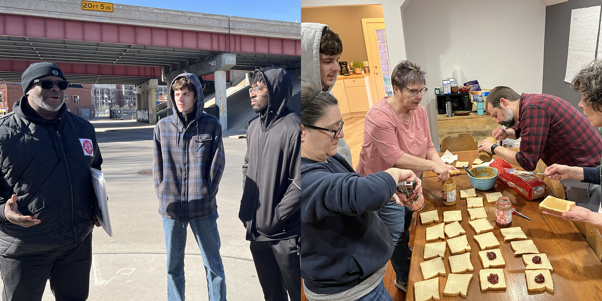 photos below: (left) Chief Egunwale Amusan, left, leads Hesston College Urban Life and Culture students on a walking tour of Tulsa’s Greenwood District, sharing the history of the 1921 Tulsa Race Massacre and recounting events at several historic locations during the group’s spring break trip to Tulsa, Okla. Also pictured are Jacob Buller and Justin Young. (right) Students and instructors from Hesston College’s Urban Life and Culture class prepare more than 100 sandwiches for Tulsa Food Not Bombs during their spring break trip to Tulsa, Okla., where they spent nine days learning about urban life, community organizations and issues of justice while participating in service opportunities across the city. Pictured clockwise: Priscilla Spiker, Jacob Buller, Margaret Brewer, Peter Lehman and Michele Hershberger.